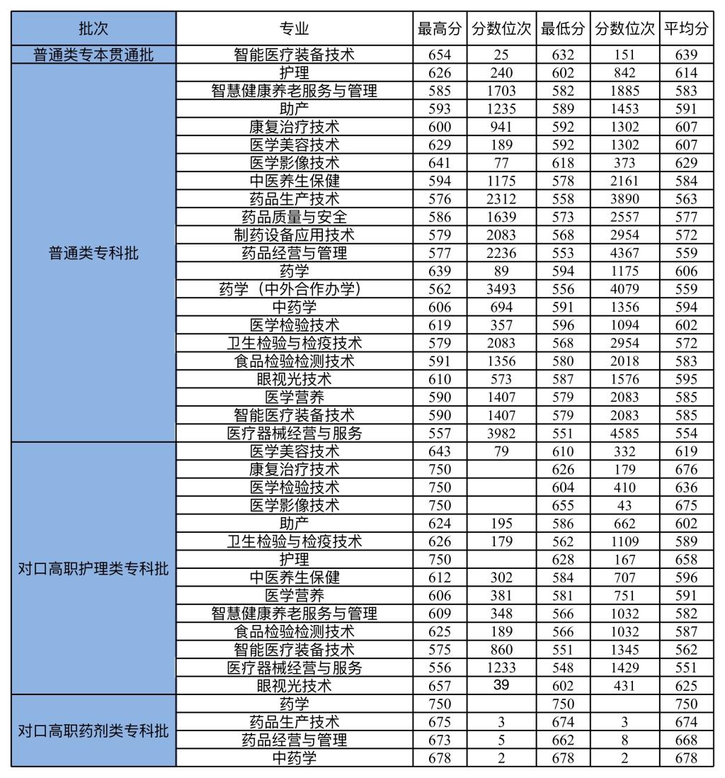 重庆医药高等专科学校2025年重庆市高职分类考试招生各专业录取分数一览表